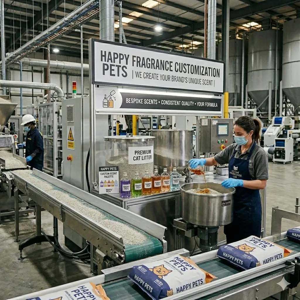 Happypets 的可冲洗膨润土猫砂使用优质天然膨润土,通过粒径与配比优化实现“快速吸收 + 硬结团 + 可溶于水”的平衡,便于日常清理与冲水处理。适配城市公寓与希望减少垃圾量的终端消费者。我们为批发商与私牌品牌提供灵活的包装与香型定制(薰衣草、咖啡、柠檬、苹果、玫瑰等),工厂可支持小批量起订与大批量稳定生产。